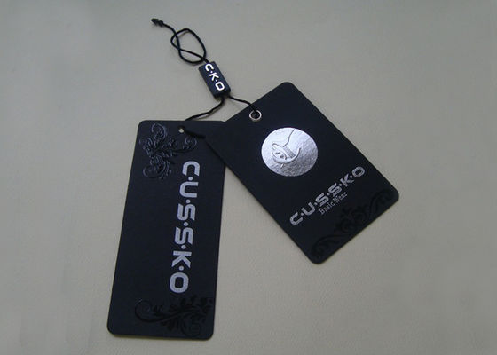 कपड़ों की लाइन के लिए प्रिंटेड पेपर हैंग टैग प्लास्टिक सील टैग यूवी कोटिंग सिल्वर फॉयल लोगो